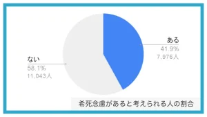 希死念慮(自殺念慮)とは死にたいと願う気持ちのことです。2025年に投稿したことがある人のうち、希死念慮があると考えられるのは7,976人(41.9%)でした。投稿内容の中に「死にたい」「自殺」「消えたい」などの言葉を含んだ投稿をしたことがある人を「希死念慮がある」と広く定義しているためデータの正確性は高くないものの、同じ基準で算出した2024年が33.1%だったため、2025年は希死念慮がある人の割合は増えました。この割合は年々増えており、きいて利用者のうち投稿機能を活用する人の悩みの重要度が大きくなっていることが考えれます。