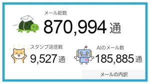 2025年にきいて内で送信されたメールの総数は870,994通でした。メールしたことがある人は10,131人であり、メール利用者は1人あたり平均で86通のメールを送っています。メール総数が474,689通だった2024年と比べると大幅に増加したことが分かります。